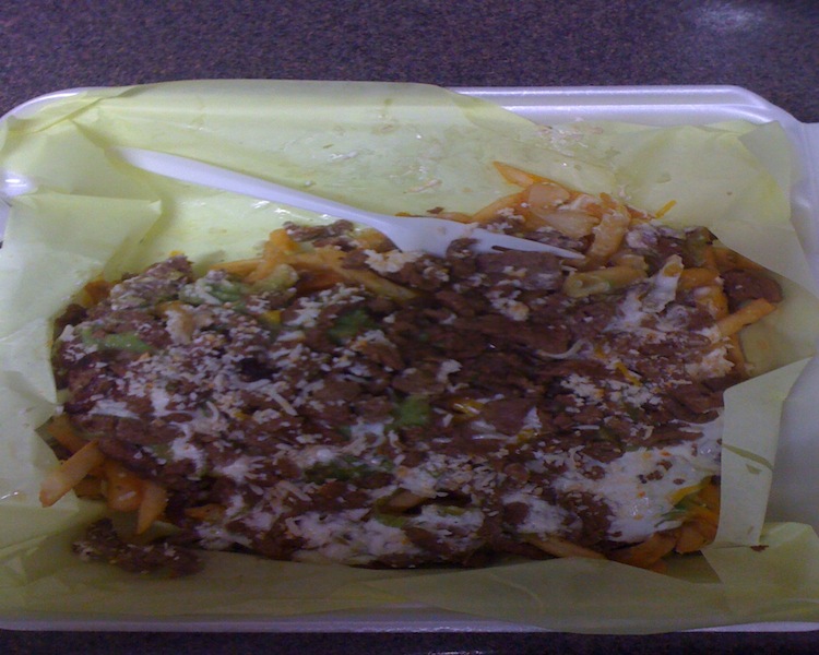 Inside it was tiny — only a few tables surrounded a counter, which separated the dining area from the kitchen. It was also crowded, always a good sign. After looking over the menu, I ordered a California burrito and one of the most wonderful sounding dishes I’ve ever come across: carne asada fries. As I would discover, carne asada fries are basically loaded nachos, only with french fries as a base instead of chips.